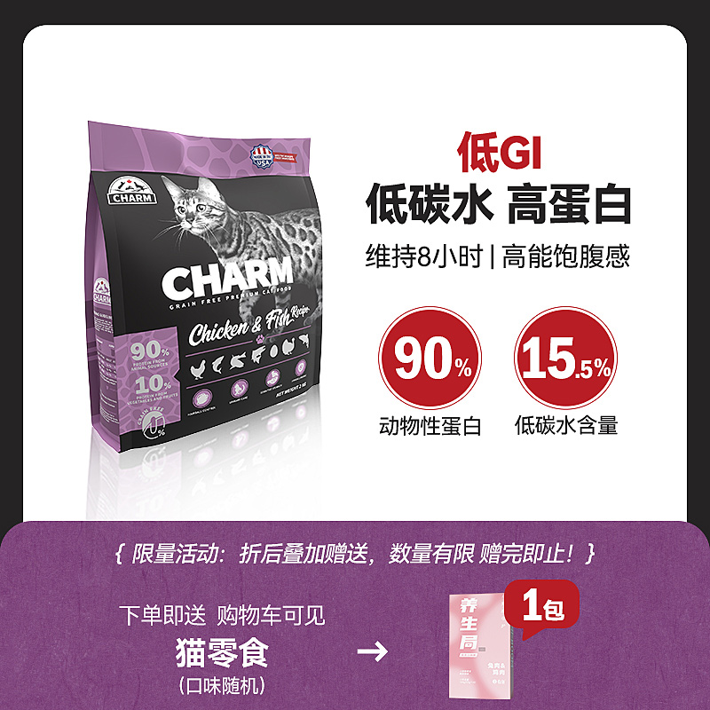 【赠1盒猫条】野性魅力CHARM 鸡肉鱼配方猫粮 2kg