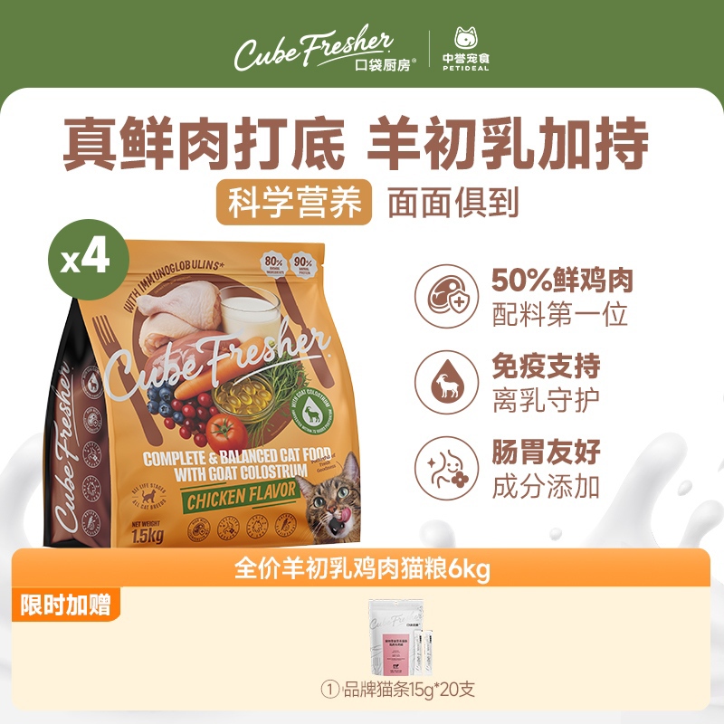 口袋厨房cube fresher 营养守护系列全价羊初乳鲜鸡肉猫粮6kg(1.5kg*4包)