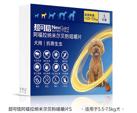 3片/盒 适合3.5-7.5kg犬只 内外同驱 有效杀除跳蚤、蜱虫 有效预防肠胃道线虫、心丝虫